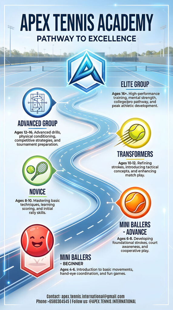 The APEX Tennis Development Programme is designed to systematically build every athlete’s technical skill, tactical intelligence, physical conditioning, and mental resilience. Through a structured and progressive training pathway, players develop strong sporting habits, teamwork, and the confidence needed to excel in competitive environments.