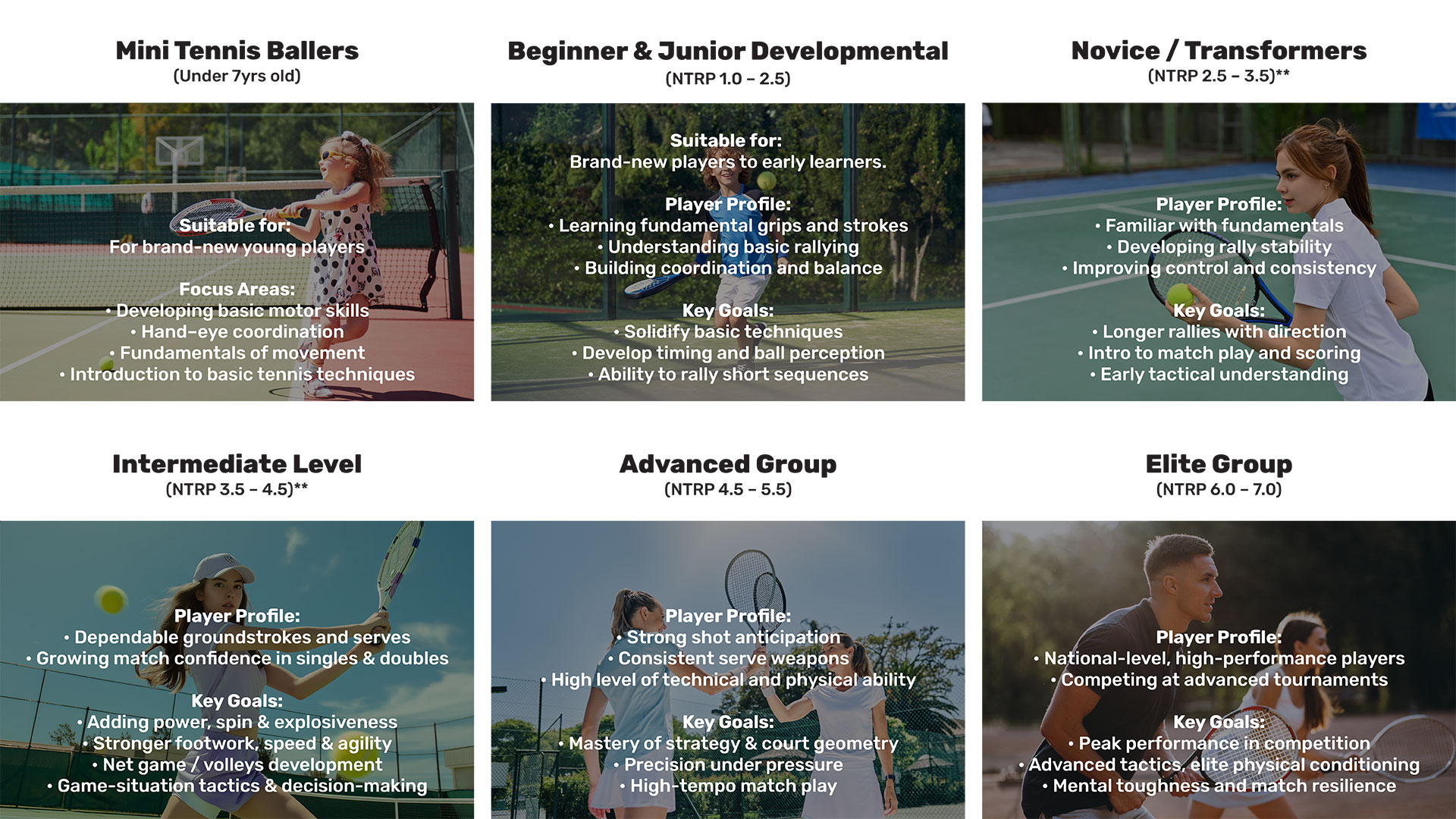Key Goals: • Peak performance in competition • Advanced tactics, elite physical conditioning • Mental toughness and match resilience (Under 7yrs old)