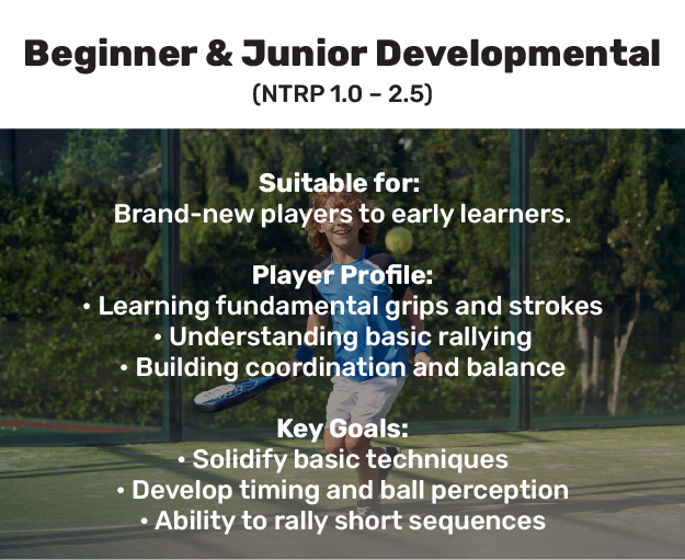 Beginner & Junior Developmental (NTRP 1.0 – 2.5)